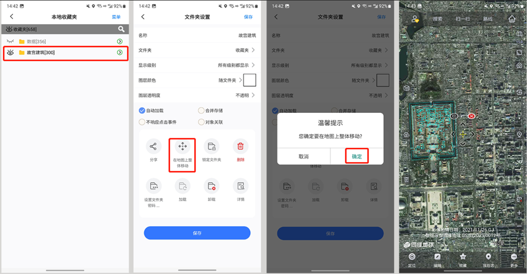 在收藏夾中點(diǎn)擊文件夾右側(cè)的圖片1按鈕,進(jìn)入文件夾設(shè)置頁(yè)面,點(diǎn)擊【在地圖上整體移動(dòng)】,提示“您確定要在地圖上整體移動(dòng)?”,點(diǎn)擊確定,在地圖上會(huì)出現(xiàn)“上下左右”操作按鈕。