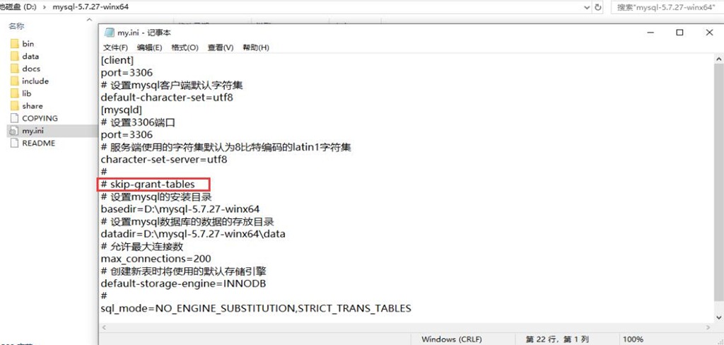 然后將my.ini文件中的skip-grant-tables注釋掉。