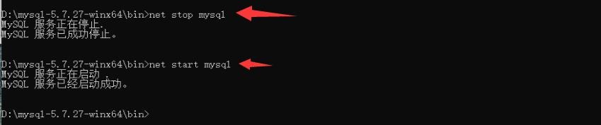 返回到cmd,重新啟動MySQL服務。執(zhí)行命令net stop mysql,停止mysql服務;再執(zhí)行命令net start mysql,啟動服務。