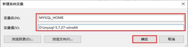 輸入變量名MYSQL_HOME和變量值D:\mysql-5.7.27-winx64(變量值為您的MySQL安裝目錄)。