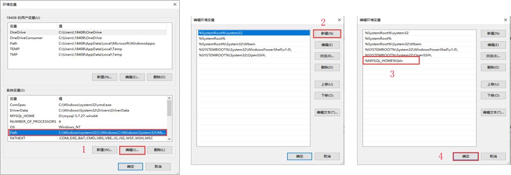 選中系統(tǒng)變量中的【Path】,點擊【編輯】,點擊【新建】,在最后輸入%MYSQL_HOME%\bin,點擊【確定】。