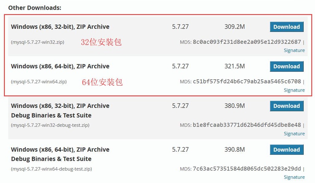 32位安裝包下載鏈接:https://dev.mysql.com/get/Downloads/MySQL-5.7/mysql-5.7.27-win32.zip