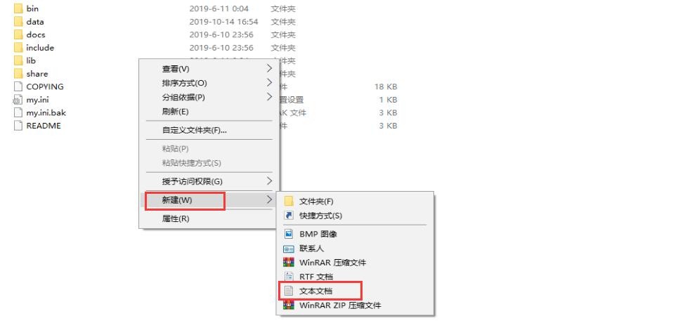 打開解壓后的mysql-5.7.27-winx64文件夾,點擊【右鍵】,新建文本文檔。