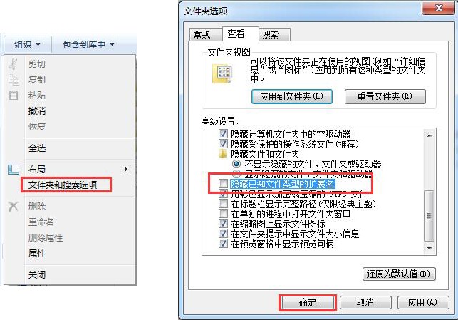 點擊【組織】,點擊【文件夾和搜索選項】,點擊【查看】,在【高級設置】中取消勾選【隱藏已知文件類型的擴展名】