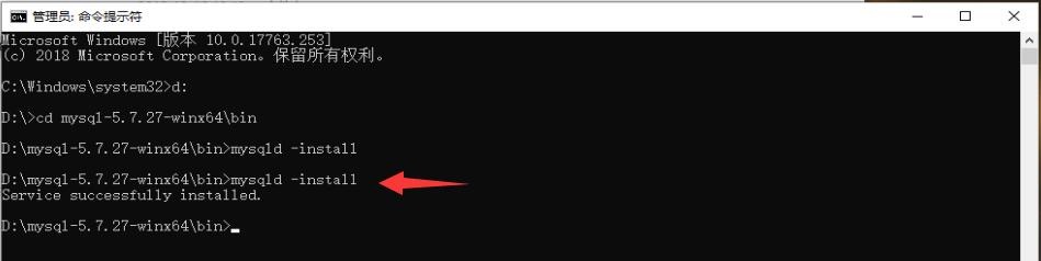 執(zhí)行命令mysqld --install,安裝MySQL服務。如下圖所示,安裝成功。