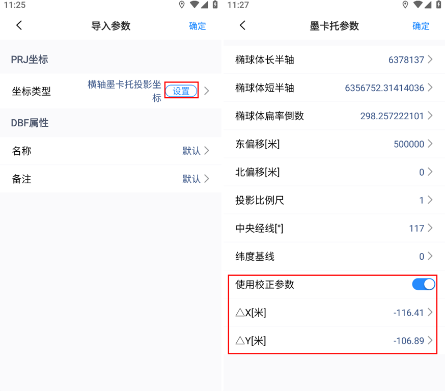 在【導(dǎo)入?yún)?shù)】設(shè)置頁面,坐標(biāo)類型保持默認(rèn),點(diǎn)擊【設(shè)置】;各參數(shù)保持不變,勾選【使用校正參數(shù)】,填寫△X和△Y。