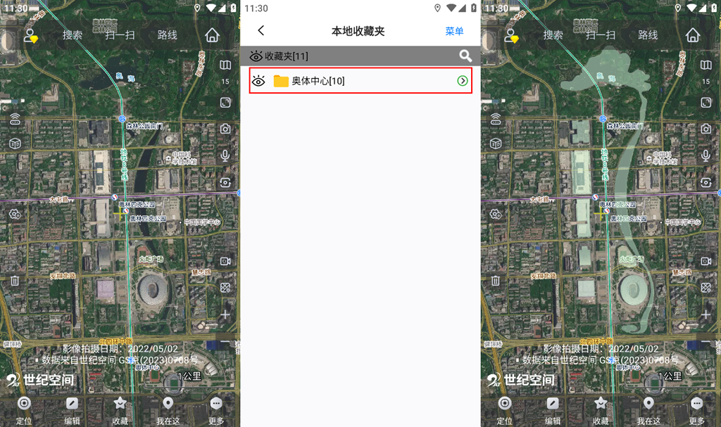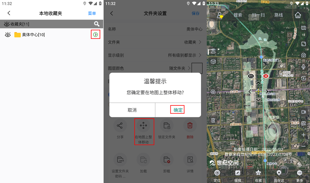 在收藏夾中點(diǎn)擊文件夾右側(cè)的圖片1按鈕,進(jìn)入文件夾設(shè)置頁面,點(diǎn)擊【在地圖上整體移動(dòng)】,提示“您確定要在地圖上整體移動(dòng)?”,點(diǎn)擊確定,在地圖上會(huì)出現(xiàn)“上下左右”操作按鈕。