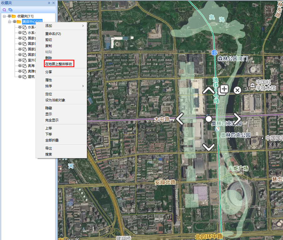 在收藏夾中選中所有數(shù)據(jù)(也可以選擇文件夾),點(diǎn)擊鼠標(biāo)右鍵,點(diǎn)擊【在地圖上整體移動(dòng)】,在地圖上會(huì)出現(xiàn)“上下左右”操作面板。