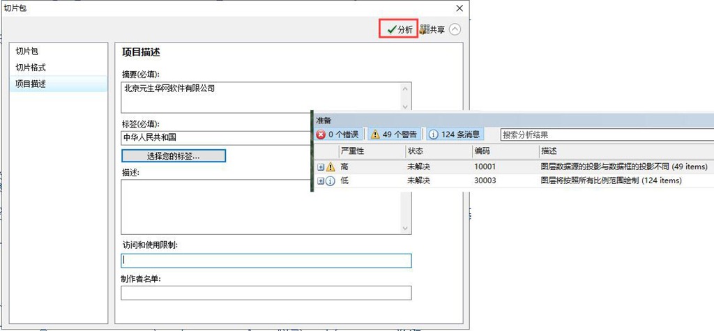 點擊【分析】,系統(tǒng)會自動對地圖數(shù)據(jù)進(jìn)行分析。如果有錯誤提示,一定要處理,否則無法切片,警告可忽略。