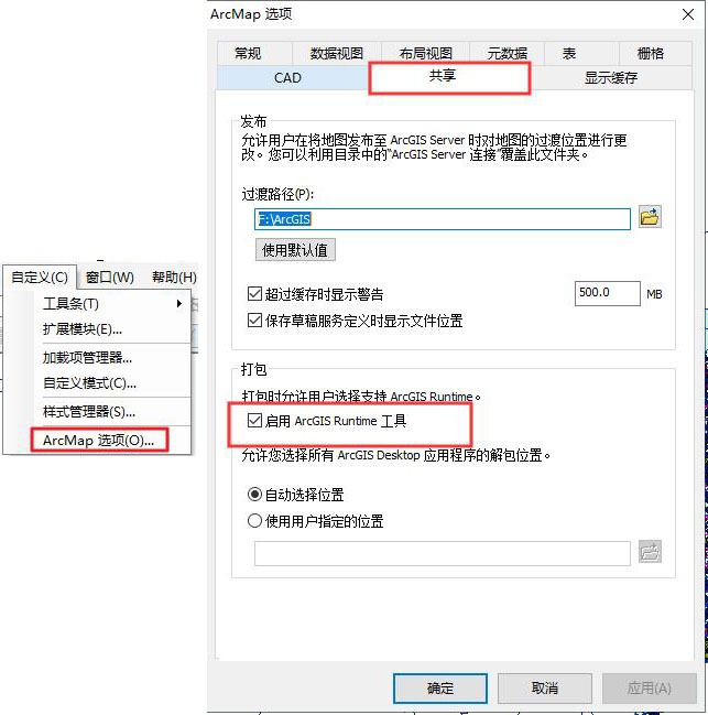 點擊[自定義]菜單,切換到[共享]選項卡,勾選【啟用ArcGIS Runtime工具】,點擊【應(yīng)用】,點擊【確定】。