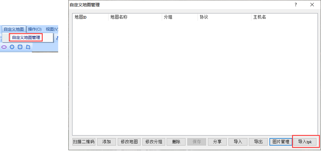 在奧維PC端主界面,點擊[自定義地圖],點擊【自定義地圖管理】,點擊【導(dǎo)入tpk】。