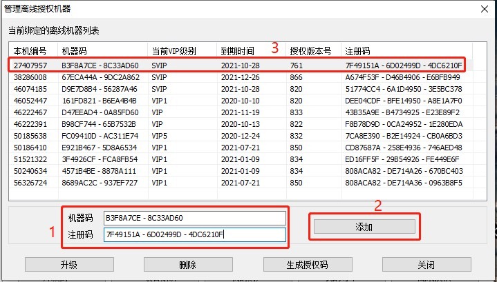 在【機器碼】和【注冊碼】欄中填入離線機器的機器碼和注冊碼,點擊【添加】,在[管理離線授權機器]窗口中正常顯示添加的機器。