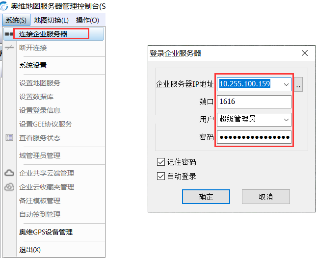 在管理控制臺(tái)中,點(diǎn)擊[系統(tǒng)]菜單,點(diǎn)擊【連接企業(yè)服務(wù)器】,輸入IP地址、端口和密碼,勾選【記住密碼】,點(diǎn)擊【確定】,即可。