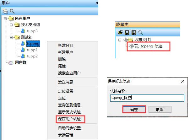 記錄完軌跡后,選中該用戶(hù),點(diǎn)擊鼠標(biāo)右鍵,點(diǎn)擊【保存用戶(hù)軌跡】,輸入名稱(chēng),點(diǎn)擊【確定】,即可將該軌跡保存到收藏夾。