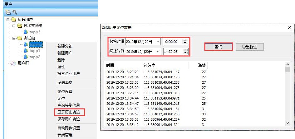 選中該用戶(hù),點(diǎn)擊鼠標(biāo)右鍵,點(diǎn)擊【顯示歷史軌跡】,設(shè)置起始時(shí)間和終止時(shí)間,點(diǎn)擊【查詢(xún)】,即可。
