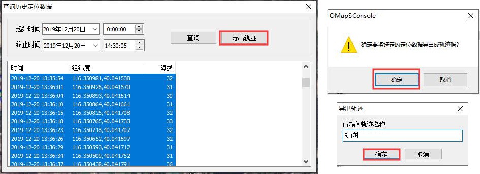 按住鍵盤(pán)shift鍵,可批量選擇定位數(shù)據(jù),點(diǎn)擊【導(dǎo)出軌跡】,點(diǎn)擊【確定】,輸入名稱(chēng),點(diǎn)擊【確定】,可將這些位置信息導(dǎo)出成軌跡,顯示在地圖上。