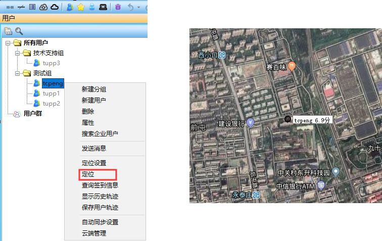 保存后,選中該用戶(hù),點(diǎn)擊鼠標(biāo)右鍵,點(diǎn)擊【定位】,即可定位出該用戶(hù)的位置,顯示在地圖上。