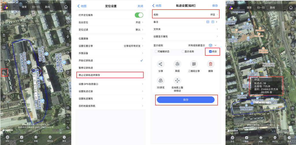 記錄完成后,再次點擊1按鈕,點擊【停止記錄軌跡并保存】,進(jìn)入[軌跡設(shè)置]頁面,輸入名稱,勾選【閉合】,點擊【保存】,即可將軌跡閉合,并保存到收藏夾中。