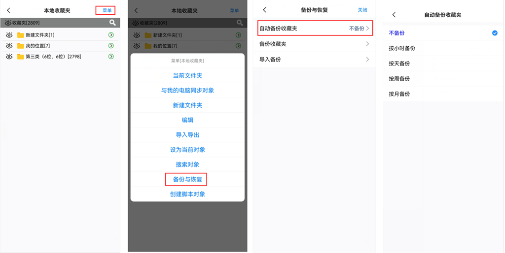 點(diǎn)擊【收藏】,點(diǎn)擊【菜單】,點(diǎn)擊【備份與恢復(fù)】,點(diǎn)擊【自動備份收藏夾】,可選擇【不備份】【按小時(shí)備份】【按天備份】【按周備份】和【按月備份】。