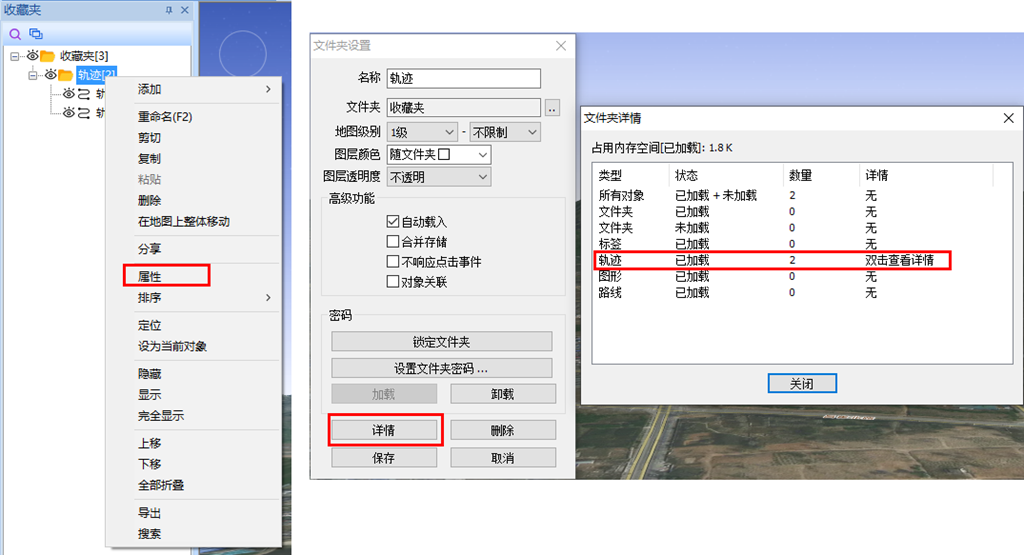 然后選中該文件夾,點(diǎn)擊鼠標(biāo)右鍵→【屬性】→【詳情】,進(jìn)入[文件夾詳情]界面;雙擊軌跡條目,查看軌跡詳情。