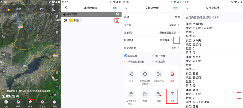 在奧維主界面,點(diǎn)擊【收藏】,進(jìn)入到[本地收藏夾];點(diǎn)擊待導(dǎo)出數(shù)據(jù)所在文件夾右側(cè)的wps13按鈕,進(jìn)入[文件夾設(shè)置];點(diǎn)擊【詳情】,點(diǎn)擊軌跡條目。