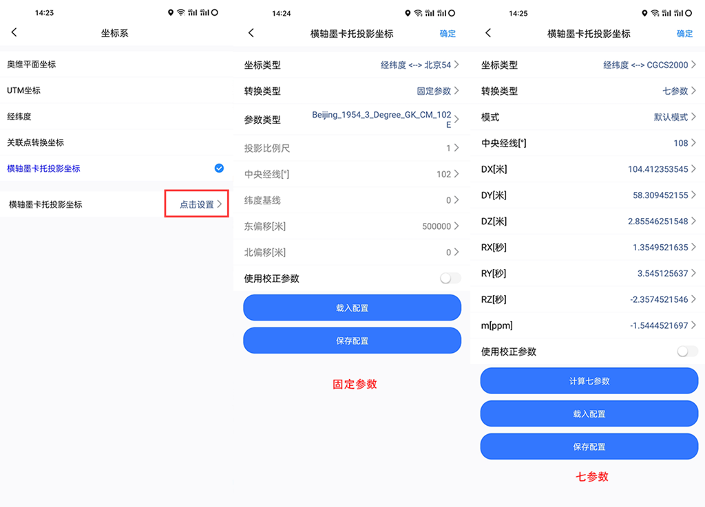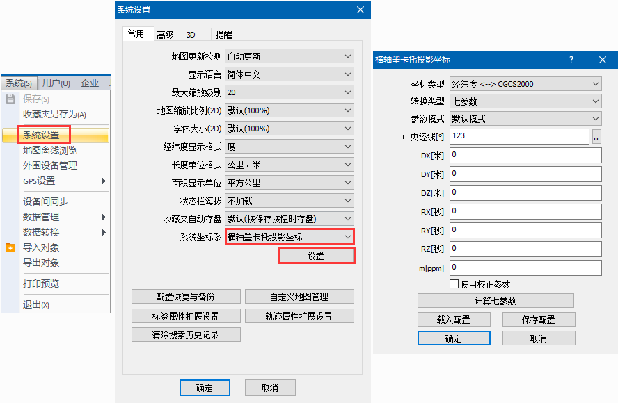 進(jìn)入[坐標(biāo)系]頁面,選擇【橫軸墨卡托投影坐標(biāo)】,點(diǎn)擊設(shè)置,設(shè)置坐標(biāo)類型、轉(zhuǎn)換類型以及相關(guān)參數(shù)。