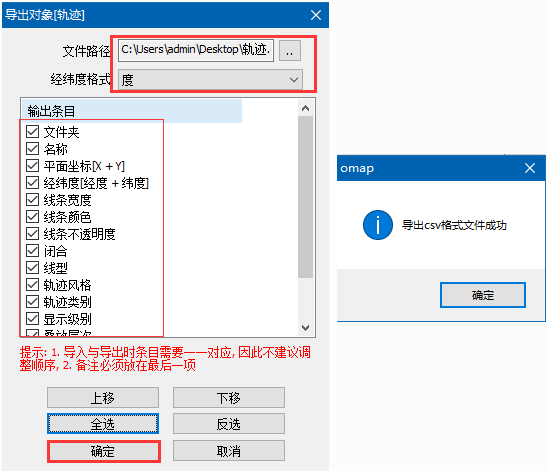 進(jìn)入[導(dǎo)出對象[軌跡]]窗口,設(shè)置文件路徑、經(jīng)緯度格式以及輸出條目,點(diǎn)擊【確定】,即可導(dǎo)出。