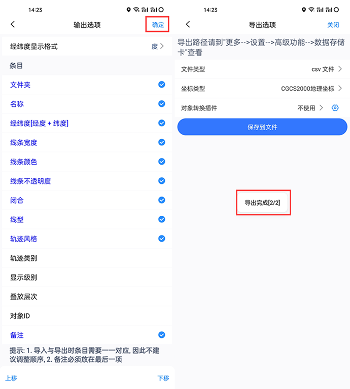 進(jìn)入[導(dǎo)出對象]頁面,點(diǎn)擊【導(dǎo)出】,設(shè)置經(jīng)緯度格式以及條目,點(diǎn)擊【確定】。