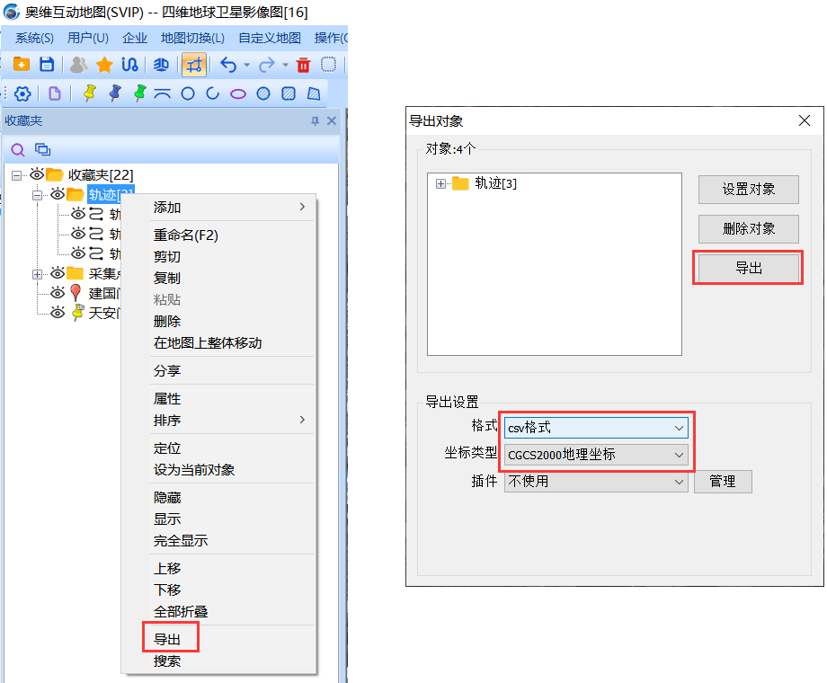 在收藏夾中,選中需要導(dǎo)出的軌跡(可以選中文件夾或者軌跡對象),點(diǎn)擊鼠標(biāo)右鍵,點(diǎn)擊導(dǎo)出;設(shè)置格式為【CSV】,坐標(biāo)類型,您可以根據(jù)自身情況進(jìn)行設(shè)置,如CGCS2000地理坐標(biāo)、GCJ-02地理坐標(biāo);點(diǎn)擊【導(dǎo)出】。這里以導(dǎo)出CGCS2000地理坐標(biāo)為例。