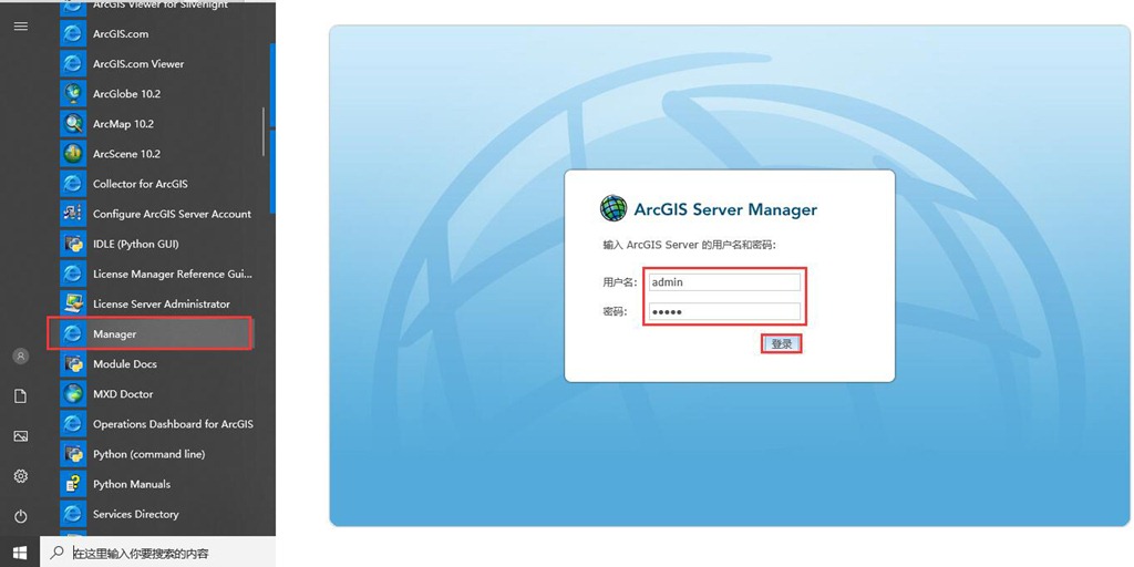 在Windows開始菜單,找到ArcGIS目錄,點擊【Manager】,輸入用戶名、密碼,點擊【登錄】。