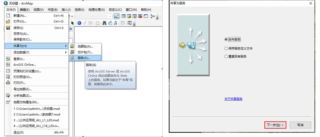 點擊【文件】→【共享為】→【服務(wù)】,選擇【發(fā)布服務(wù)】,點擊【下一步】。