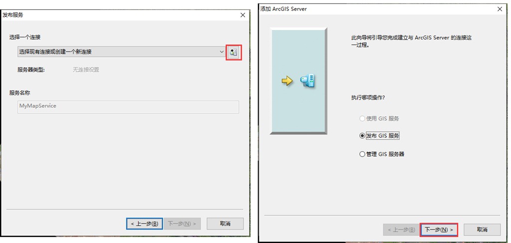 進入[發(fā)布服務(wù)]窗口,點擊下拉框右邊的wps7按鈕,進入[添加ArcGIS Server]窗口,選擇【發(fā)布GIS服務(wù)】,點擊【下一步】。