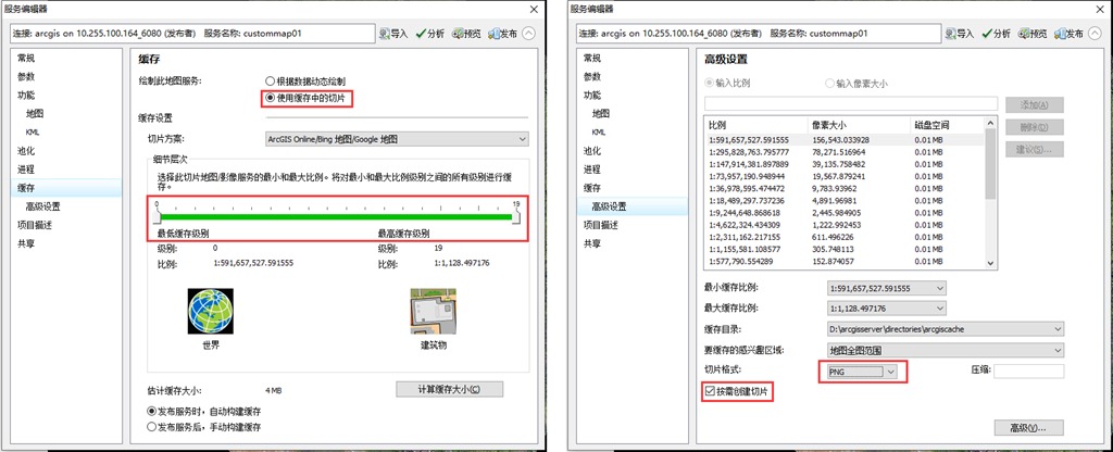 切換到[高級設(shè)置],設(shè)置最小緩存比例、最大緩存比例、切片格式,勾選【按需創(chuàng)建切片】。