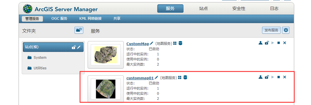 地圖服務(wù)發(fā)布成功后,可在ArcGIS Server Manager中查看。