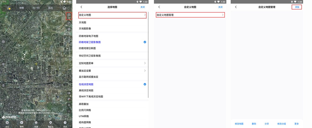 在奧維手機端主界面,點擊圖片1按鈕,點擊【自定義地圖】→【自定義地圖管理】→【添加】。