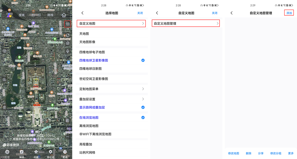 在主界面上,點(diǎn)擊【圖層】,點(diǎn)擊【自定義地圖】,點(diǎn)擊【自定義地圖管理】,進(jìn)入[自定義地圖管理]頁面,點(diǎn)擊【添加】。