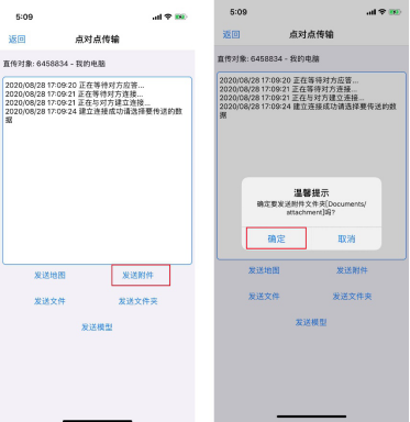 在手機端[點對點傳輸]頁面,點擊【發(fā)送附件】,彈出提示“確定發(fā)送附件文件夾[Documents/attachment]嗎?”,點擊【確定】。
