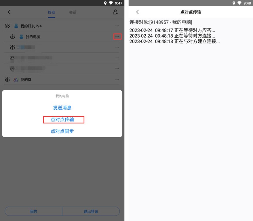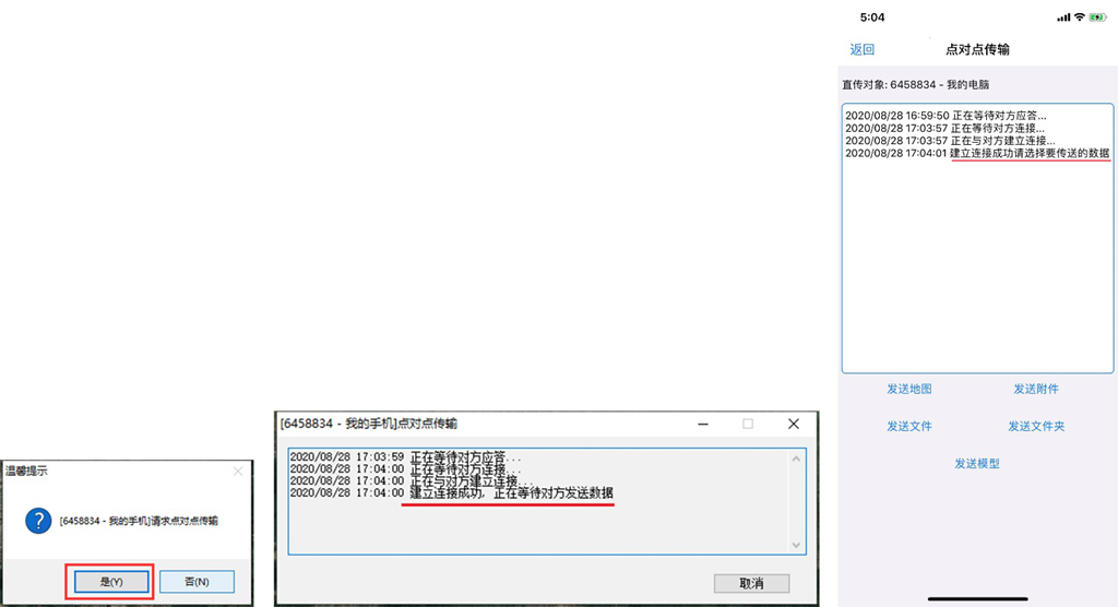 同時,電腦端(或?qū)?yīng)的好友)彈出提示“請求點對點傳輸”,點擊【是】,等待[點對點傳輸]界面提示“建立連接成功”。