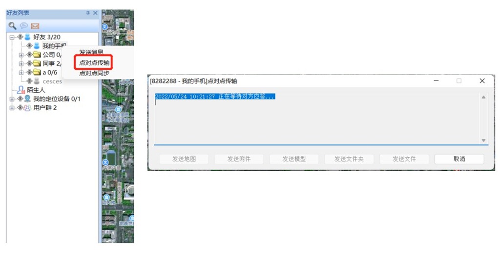 發(fā)送者在電腦端[好友列表]中找到【我的手機】(或?qū)暮糜眩髽擞益I,選擇【點對點傳輸】。地圖界面會彈出[點對點傳輸]界面。
