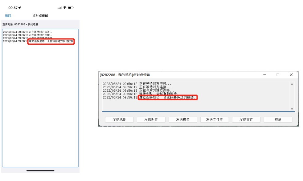 同時,手機端等待[點對點傳輸]窗口提示“建立連接成功”。