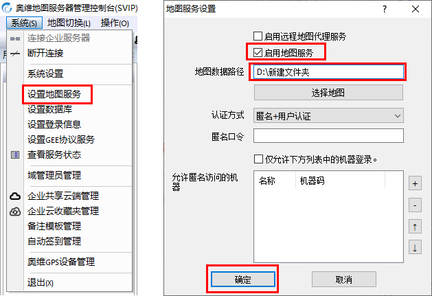 勾選【啟用地圖服務(wù)】,設(shè)置地圖數(shù)據(jù)路徑(注意:該路徑為服務(wù)器存放地圖數(shù)據(jù)的路徑),點擊【確定】,保存配置。