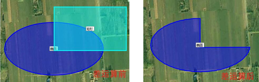 效果2如下圖所示,一個(gè)橢圓和一個(gè)矩形作“差”運(yùn)算(即“橢圓減矩形”),矩形被刪除(包括兩個(gè)圖形相交的部分)。