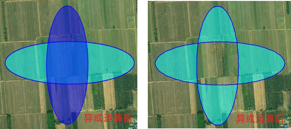 異或運(yùn)算:將多個(gè)圖形相交(重疊)部分刪除,并組合成一個(gè)圖形。如果多個(gè)不相交的圖形作“異或”運(yùn)算,其效果為圖形“合并”。