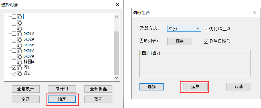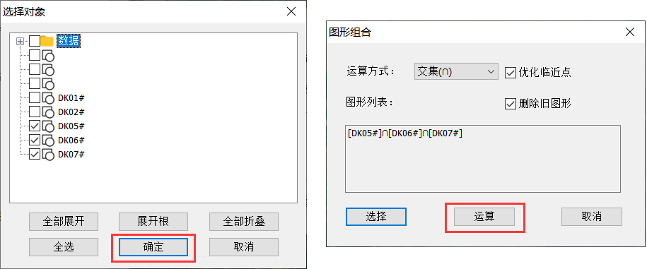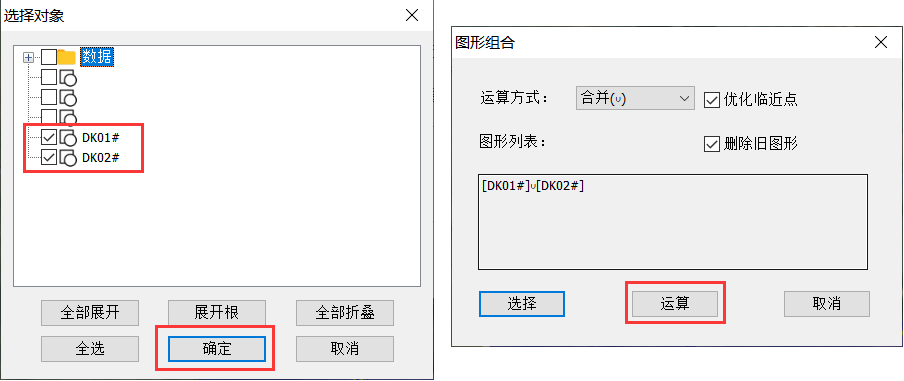勾選需要合并的圖形,點(diǎn)擊【確定】—>【運(yùn)算】,提示“操作成功”即可。