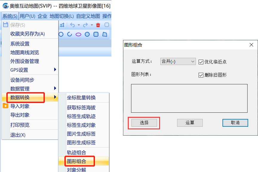 在奧維電腦端,點(diǎn)擊[系統(tǒng)]—>【數(shù)據(jù)轉(zhuǎn)換】—>【圖形組合】;運(yùn)算方式,選擇【合并】,點(diǎn)擊【選擇】。