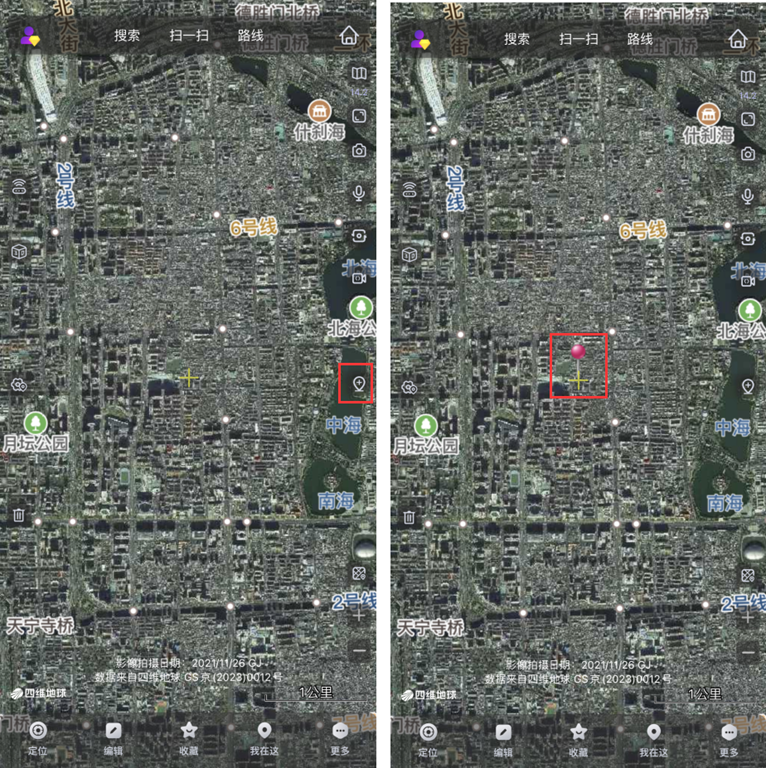 點(diǎn)擊左下角“定位”圖標(biāo),屏幕中心點(diǎn)即可回到當(dāng)前所在位置;