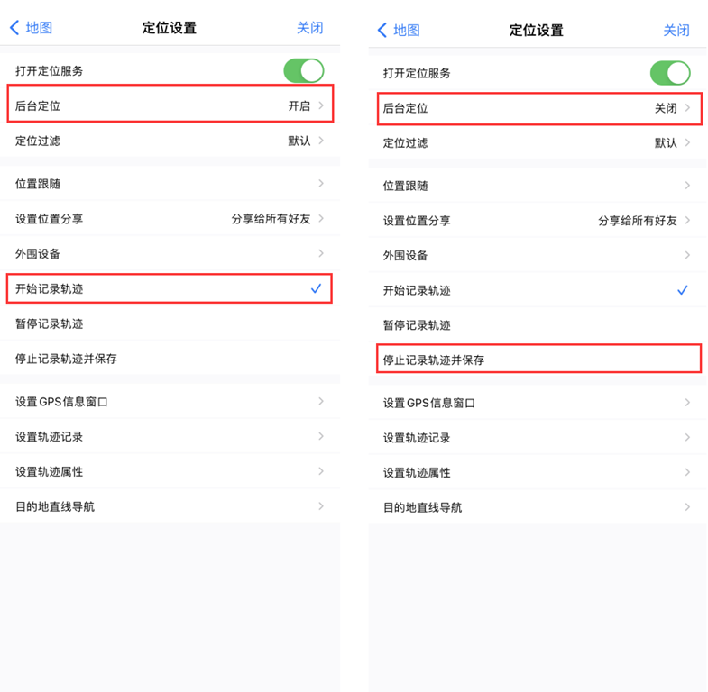 記錄軌跡:打開(kāi)“后臺(tái)定位”,選擇“開(kāi)始記錄軌跡”,即可記錄行動(dòng)軌跡,結(jié)束時(shí)選擇“停止記錄軌跡并保存”,同時(shí)關(guān)閉“后臺(tái)定位”(否則耗電大)