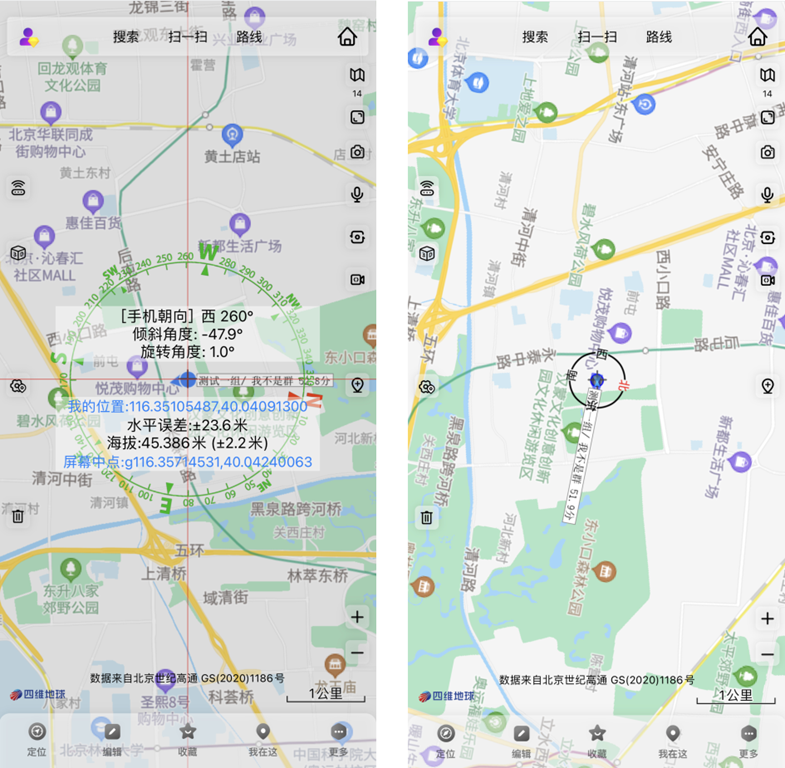 再次點(diǎn)擊,則顯示當(dāng)前位置的各項(xiàng)數(shù)據(jù),三擊則顯示指南針標(biāo)識(shí)。