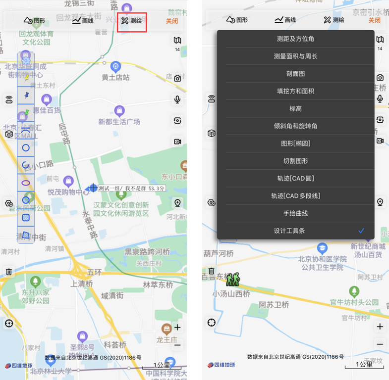(3)測(cè)繪:點(diǎn)擊“測(cè)繪”選擇自己所需功能