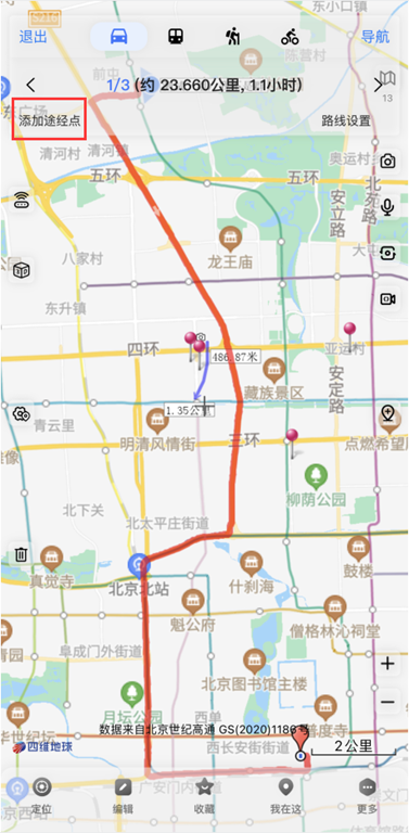 路線中如需經(jīng)過(guò)某地,可以點(diǎn)擊“添加途徑點(diǎn)”